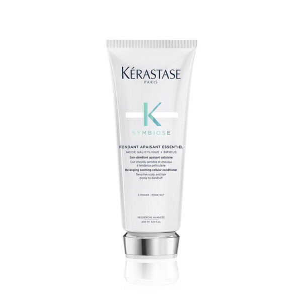 Symbiose Fondant Apaisant Essentiel da Kérastase é um condicionador anticaspa calmante, com ação desembaraçante, sem sulfato e sem silicone para couro cabeludo sensível, com tendência a caspa. Contém ácido salicílico para um couro cabeludo mais leve e bifidus para um couro cabeludo saudável. Uma fórmula hidratante para aliviar desconfortos e preservar a barreira do couro cabeludo. Cuidado intenso, porém, leve para o couro cabeludo e comprimento do cabelo. Reduz a sensibilidade do couro cabeludo desde a 1ª aplicação e aumenta a vitalidade do cabelo ao longo do tempo* O Fondant Apaisant Essentiel tem uma textura balsâmica branca bastante sensorial e luxuosa combinada com uma fragrância fina e luxuosa .